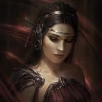 a female character with dark hair, wearing what appears to be ancient Roman or Greek armor and adorned with jewelry that includes a headband or helmet. She is looking down, her eyes closed, giving the impression of contemplation or