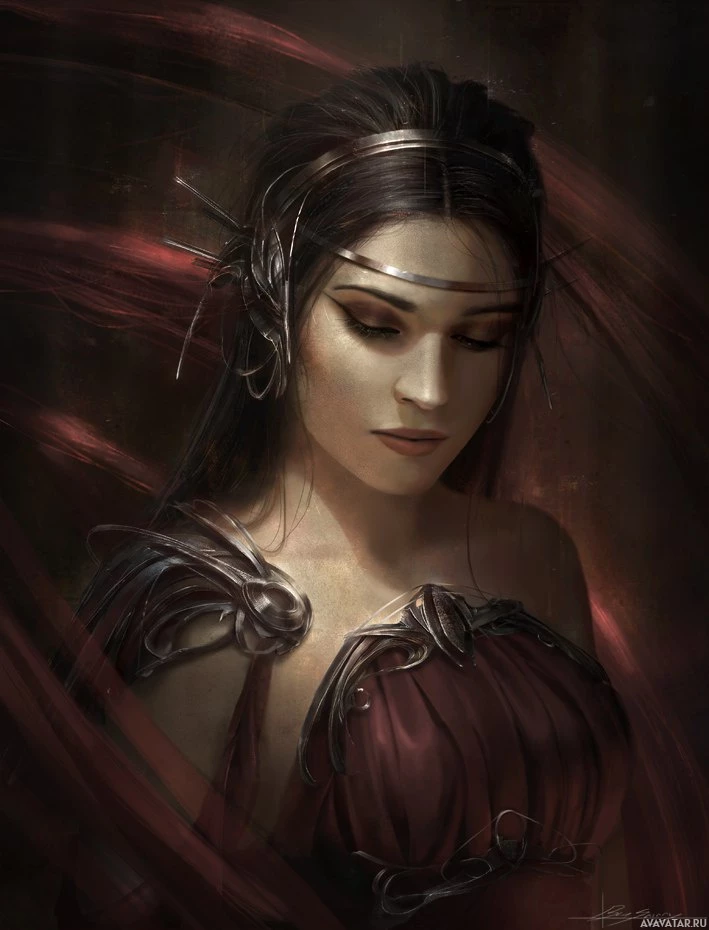 deep thought. The style of the artwork has a fantasy-like quality to it, suggesting she could be a character from a mythological story or a work of