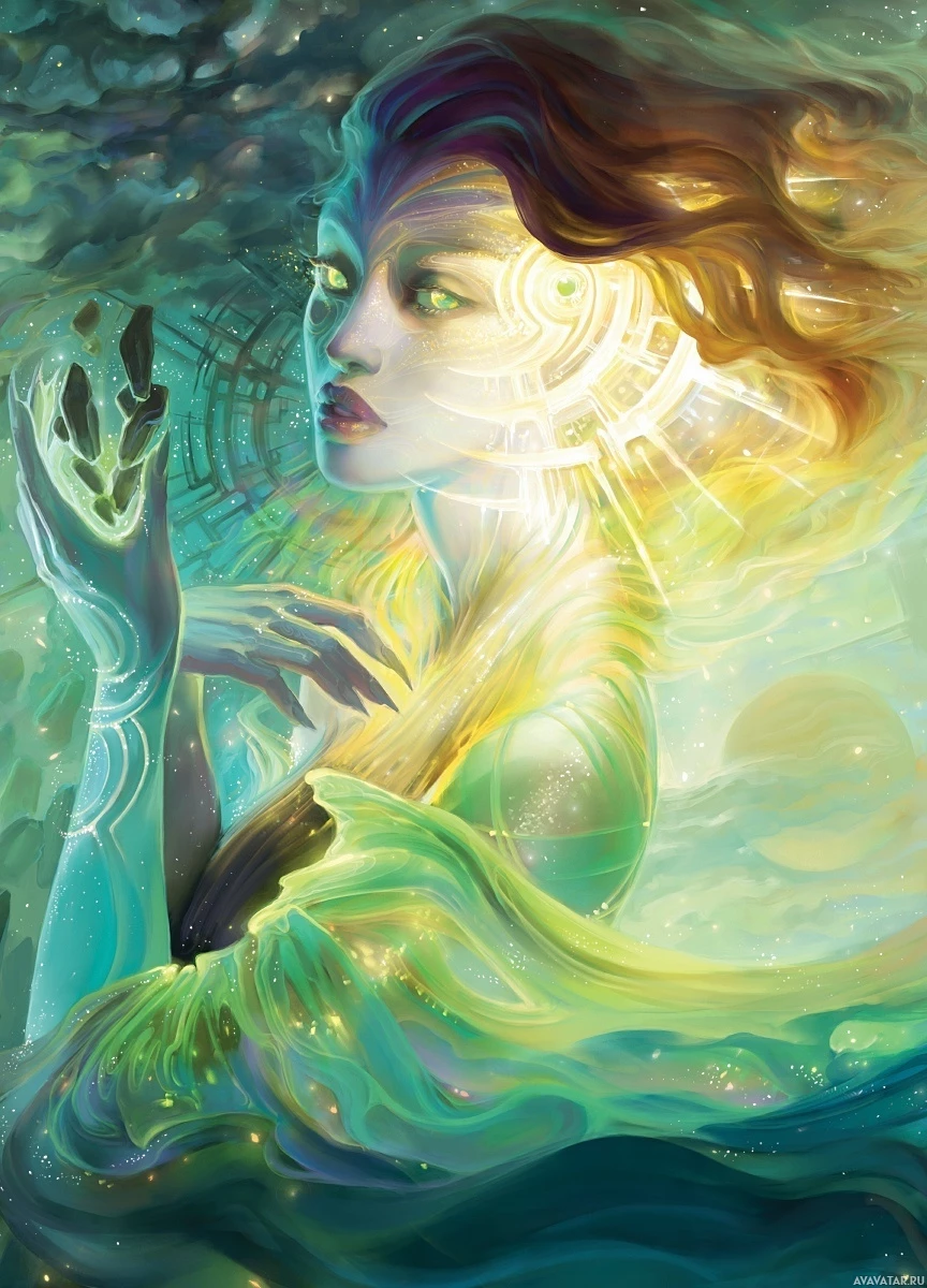an enigmatic figure with elements that suggest mysticism or otherworldly powers, such as the glowing energy radiating from her hands and the ethereal floating effect around her. Her expression is serene yet contemplative, and she seems to be in