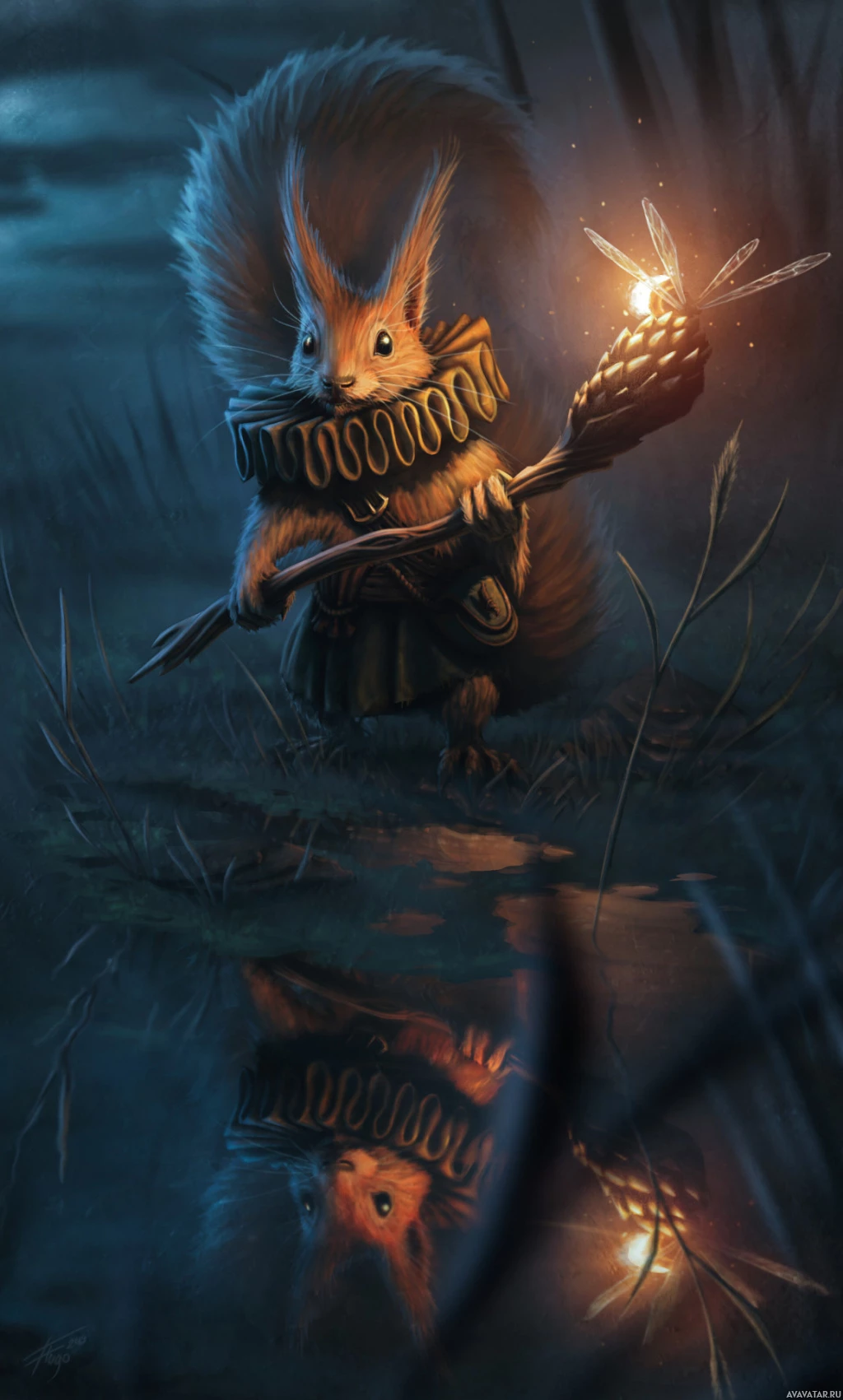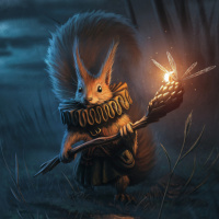 a soft glow around it, illuminating the dark surroundings. Its reflection is visible on the water's surface, creating a serene and magical atmosphere. The artwork is highly detailed and imaginative, portraying the squirrel in a human-like role with elements of fantasy and mysticism.