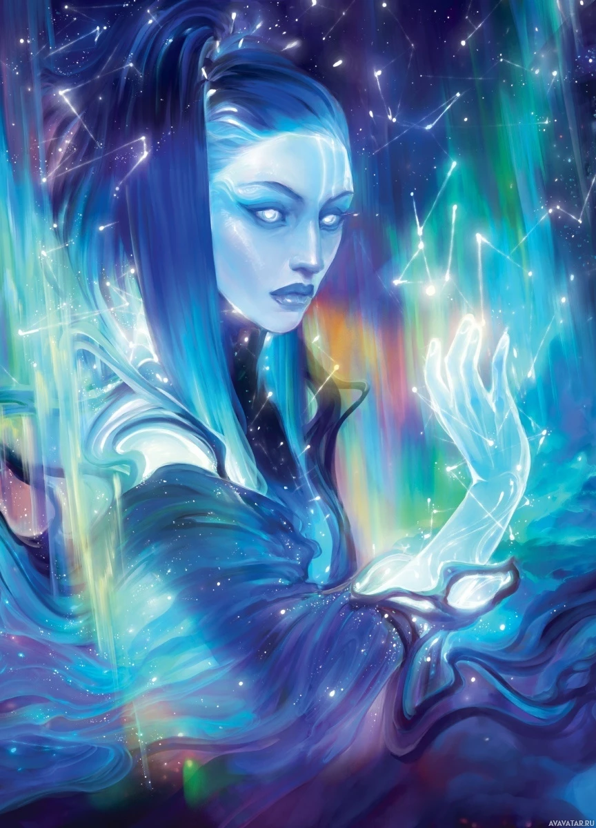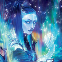 blue hair and a fantasy-themed design. She appears to have a mystical or otherworldly appearance, possibly suggesting a character from