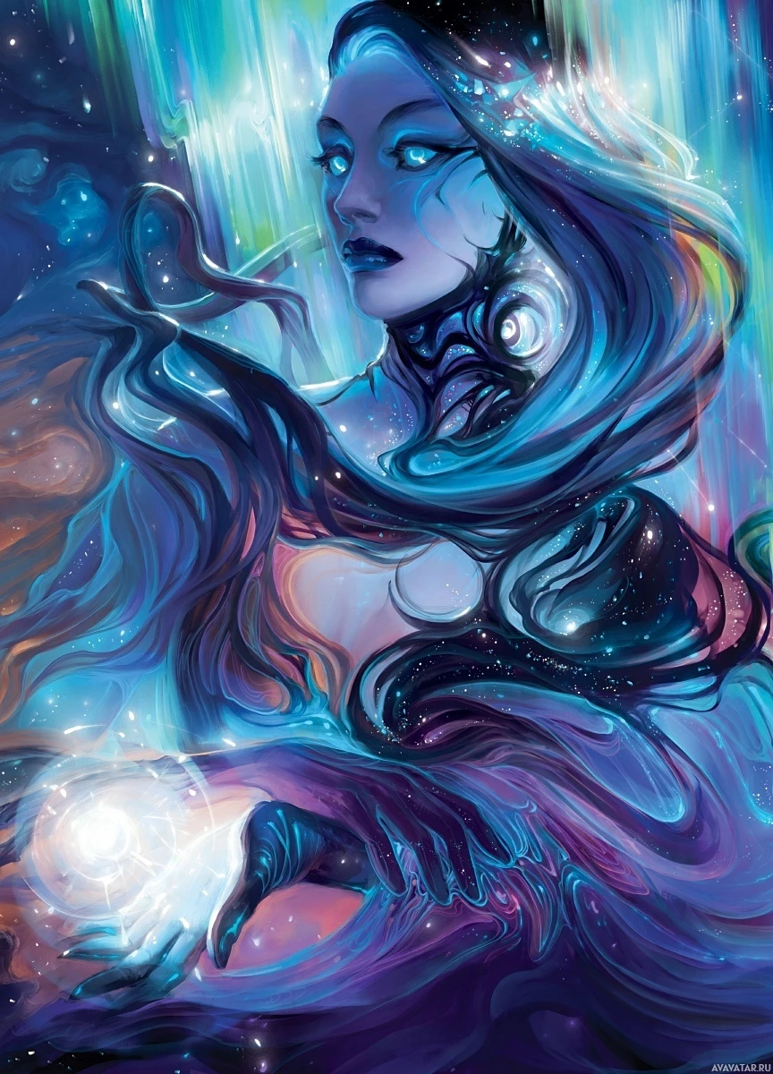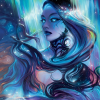 cosmic energy. Her expression is serious and focused, suggesting she might be performing a spell or engaging in