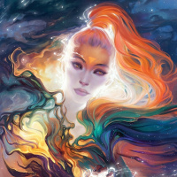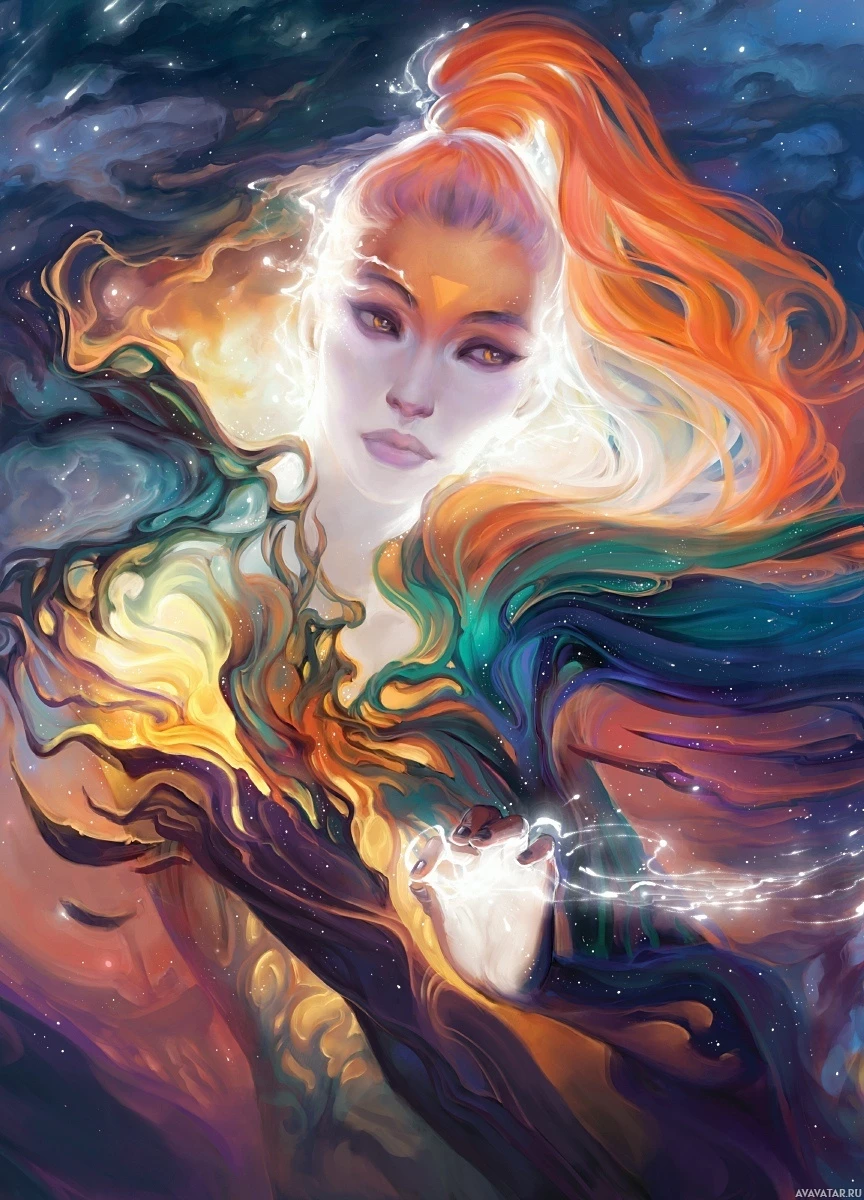 vibrant colors that blend into her surroundings. The background features swirling patterns and stars, implying a cosmic or