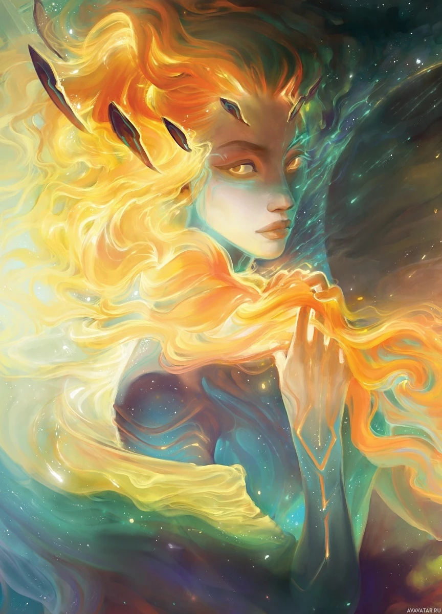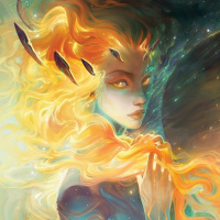red hair that transitions into what appears to be flames or fire at the ends. She has pointed ears and is wearing what looks like armor or a garment with