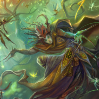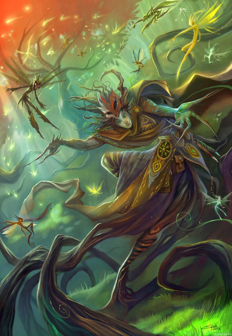 magical energy or incantations being cast by the character. 4. The character is dressed in robes with intricate designs, which are often associated with mysticism or arcane knowledge in fantasy settings. 5. The overall color palette is rich and vibrant, with a blend of greens, reds, and yellows that adds to the magical ambiance of the scene. 6. The ground appears to be covered in moss and other vegetation, further enhancing the sense of being in a mystical or ancient forest.