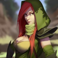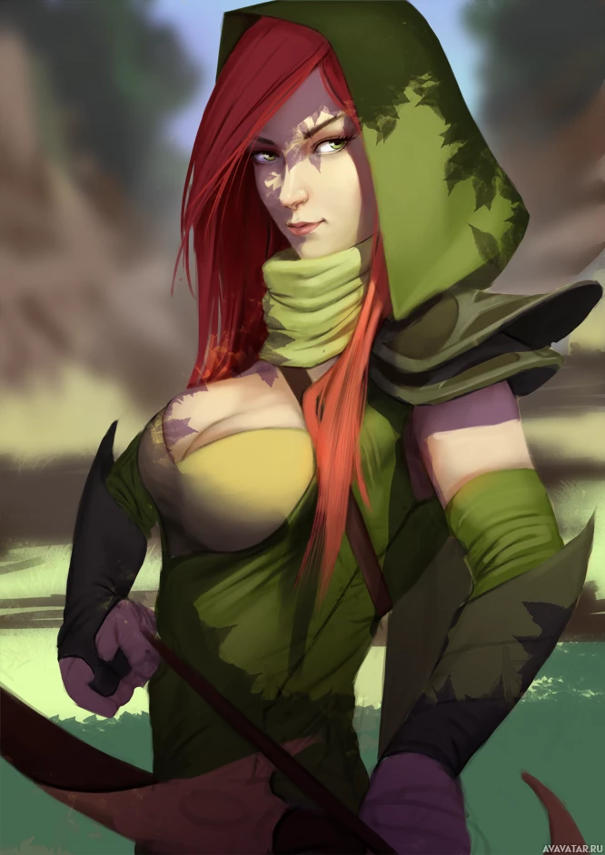 red hair and is wearing a green outfit with a hood, which could suggest that she is a member of a guild from the game "Dota 2," known as Windranger. She is also holding a bow, indicating that she may have ranged