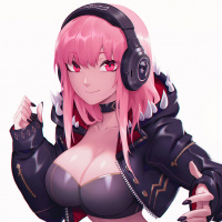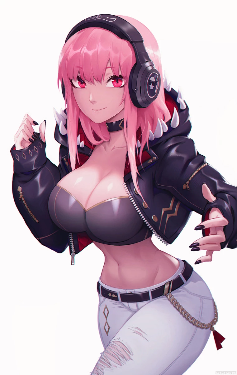 На картинке изображен анимационный персонаж с розовыми волосами, в наушниках и черной куртке поверх джинсовой рубашки. На ней также надето ожерелье на цепочке, и она держит руки у лица.