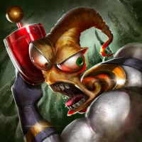 human form and is shown holding what looks like a red plunger. He has an exaggerated expression of surprise or shock on his face, which is characteristic of the humor found in