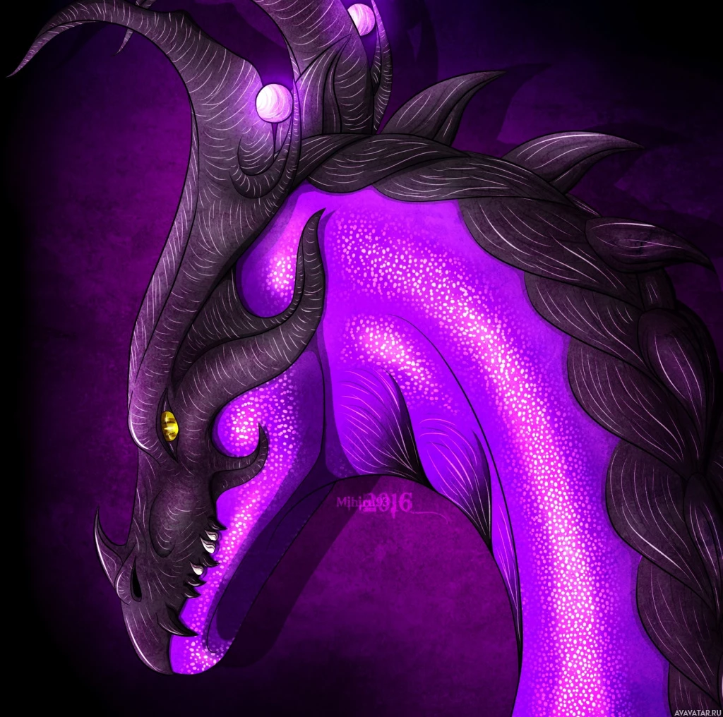 На картинке изображен дракон в стиле фэнтези. У него фиолетовая чешуя с более темными деталями, такими как рога и колючая грива. Дракон изображен в стилизованной манере, которая обычно ассоциируется с искусством фэнтези.