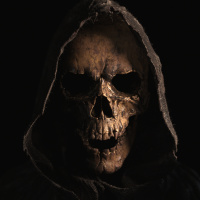 a skeletal figure wearing a dark robe and hood, with the head covered by a piece of fabric that is pulled down over the eyes. The figure appears to be a representation of