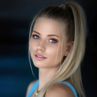 На картинке изображена молодая женщина со светлыми волосами. На ней надет синий топ, а волосы уложены свободными волнами, зачесанными на одну сторону. Ее макияж выглядит естественно, подчеркивая черты лица, и на лице у нее уверенное выражение.