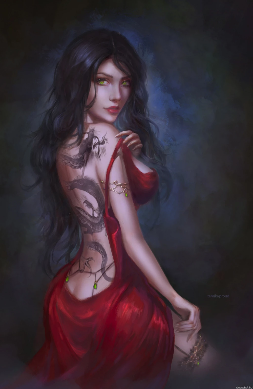 a red dress that appears to be a gown or evening wear. The style of the image suggests it could be inspired by fantasy or