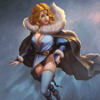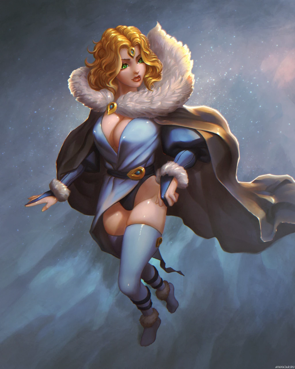 blonde hair, is wearing an outfit that includes a fur-lined coat, gloves, and boots. There are also some fantasy elements present, such as what appears to be a cloak or cape with
