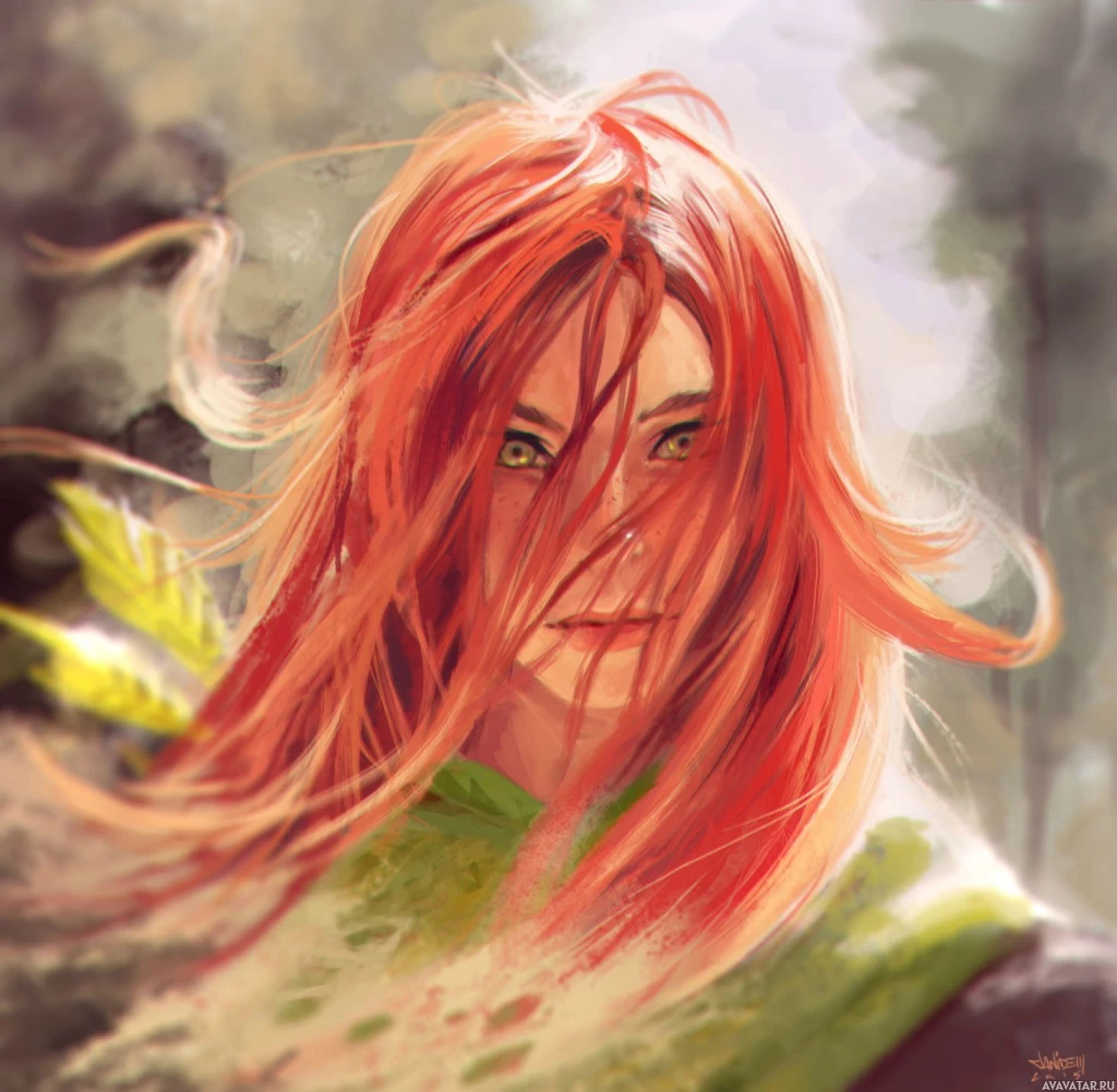 На картинке изображен иллюстрированный персонаж, который кажется Виндрангером из игры «Дота 2». Она герой с характерной внешностью, с длинными рыжими волосами и зеленым нарядом. Персонаж имеет интенсивное выражение лица и, кажется, стоит в лесоподобной среде.
