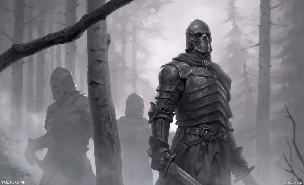 an armored figure with a helmet and sword, standing alert and looking to the side, as if ready for action. Behind this central figure, two other figures can be seen; they are wearing similar armor and also armed with swords. They appear to be either preparing to join