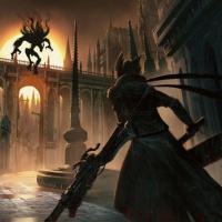 the video game "Bloodborne." It features a character who appears to be wearing armor and is holding a weapon, likely a firearm, given its design. They are standing in front of an arched doorway or passage that leads into