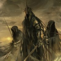 dark armor with a tall helmet and is holding his sword, ready for battle. To either side of him are two other figures that could be his lieutenants or fellow Ringwraiths, similarly armed and cloaked in black, conveying