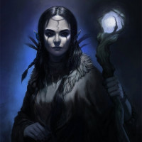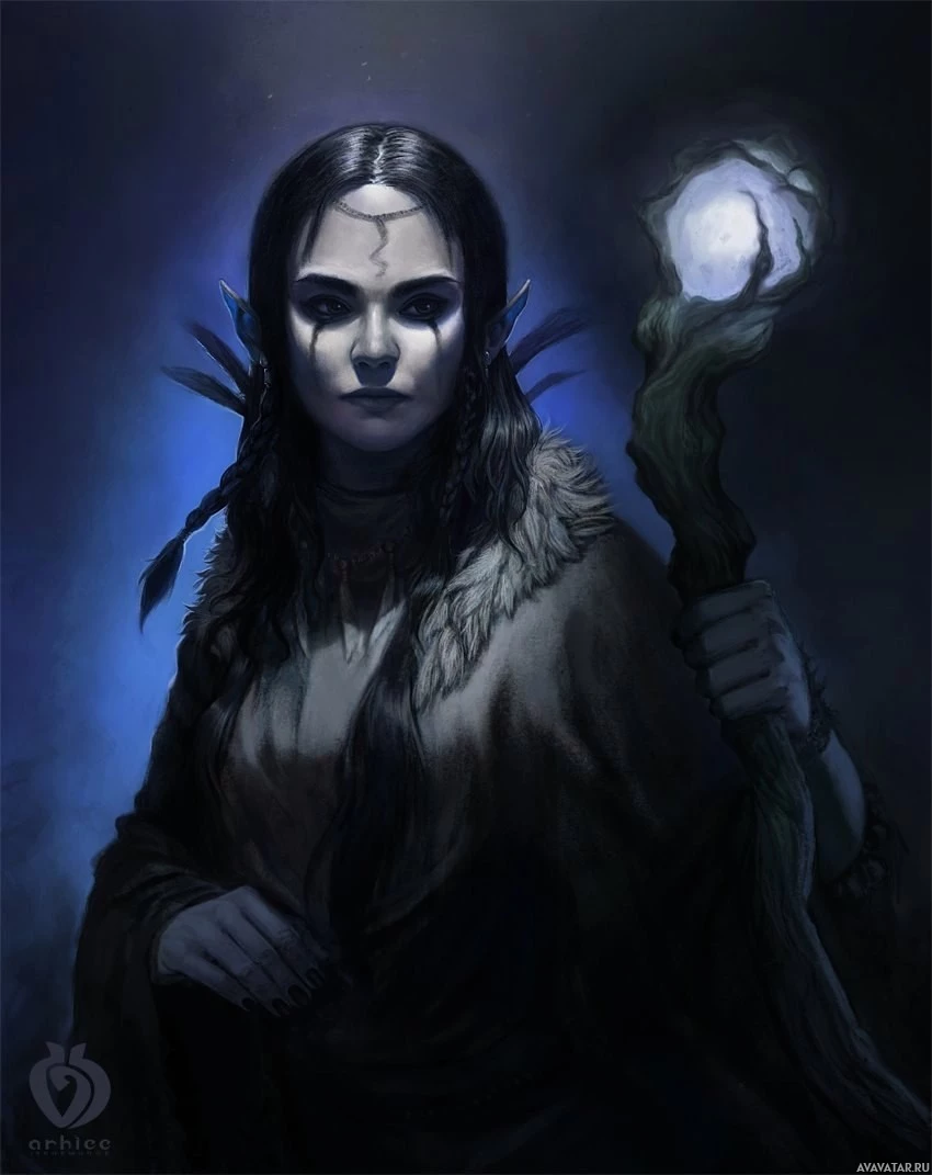 a glowing orb that could represent a source of light or magic in this fantasy context. The style of the artwork is detailed and realistic, with a focus on the figure's features and expression, conveying a sense of mystique and otherworldliness typical of fantasy-themed illustrations.