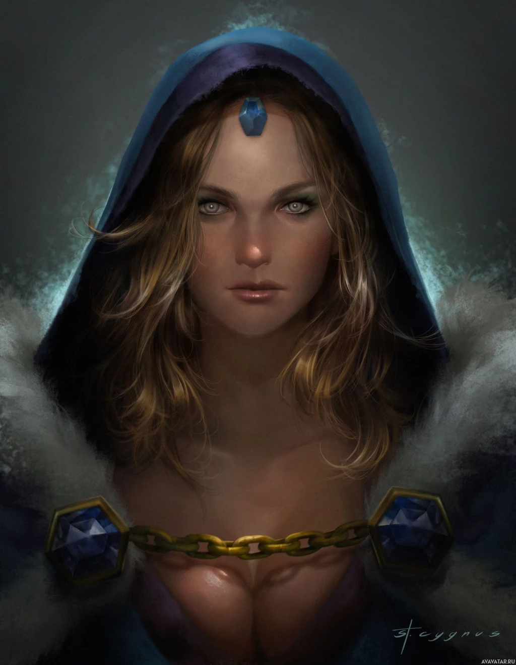 a blue gem that is characteristic of her appearance in the game. The art style suggests it could be a fan-made or commissioned piece rather than official