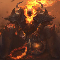 sharp teeth, and eyes that emit a fiery glow. The character is also adorned with flames, indicating an association with fire or