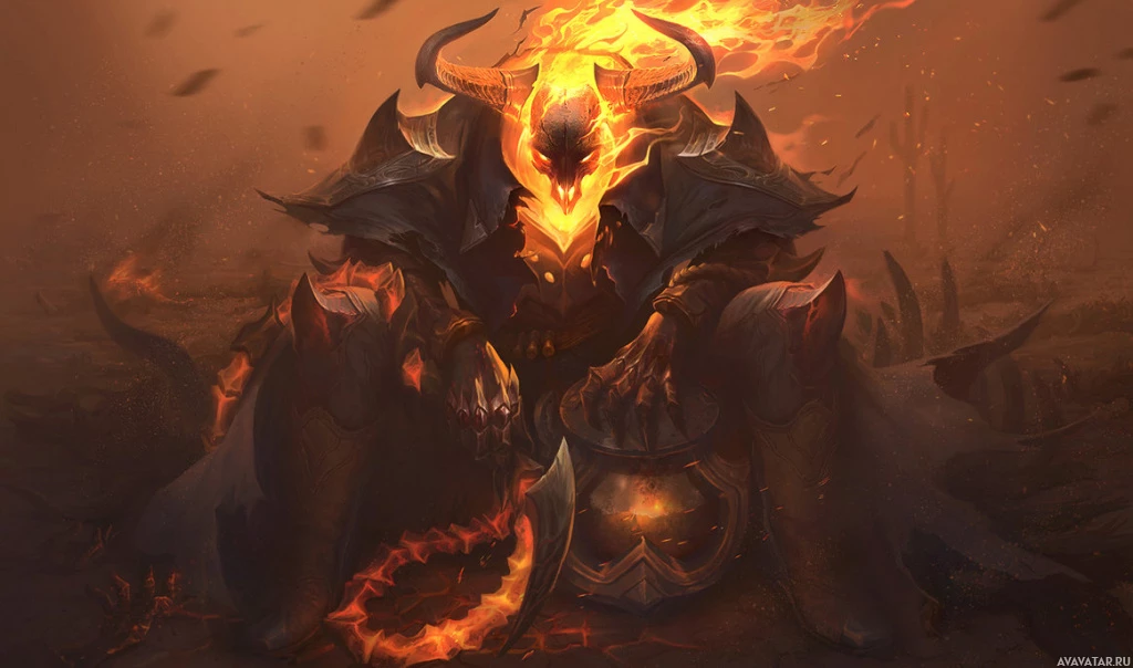 the elemental power of flame. The background is dark and ominous, reinforcing the evil or
