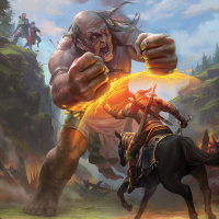 a fantasy scene featuring two warriors engaged in combat. One is a giant with