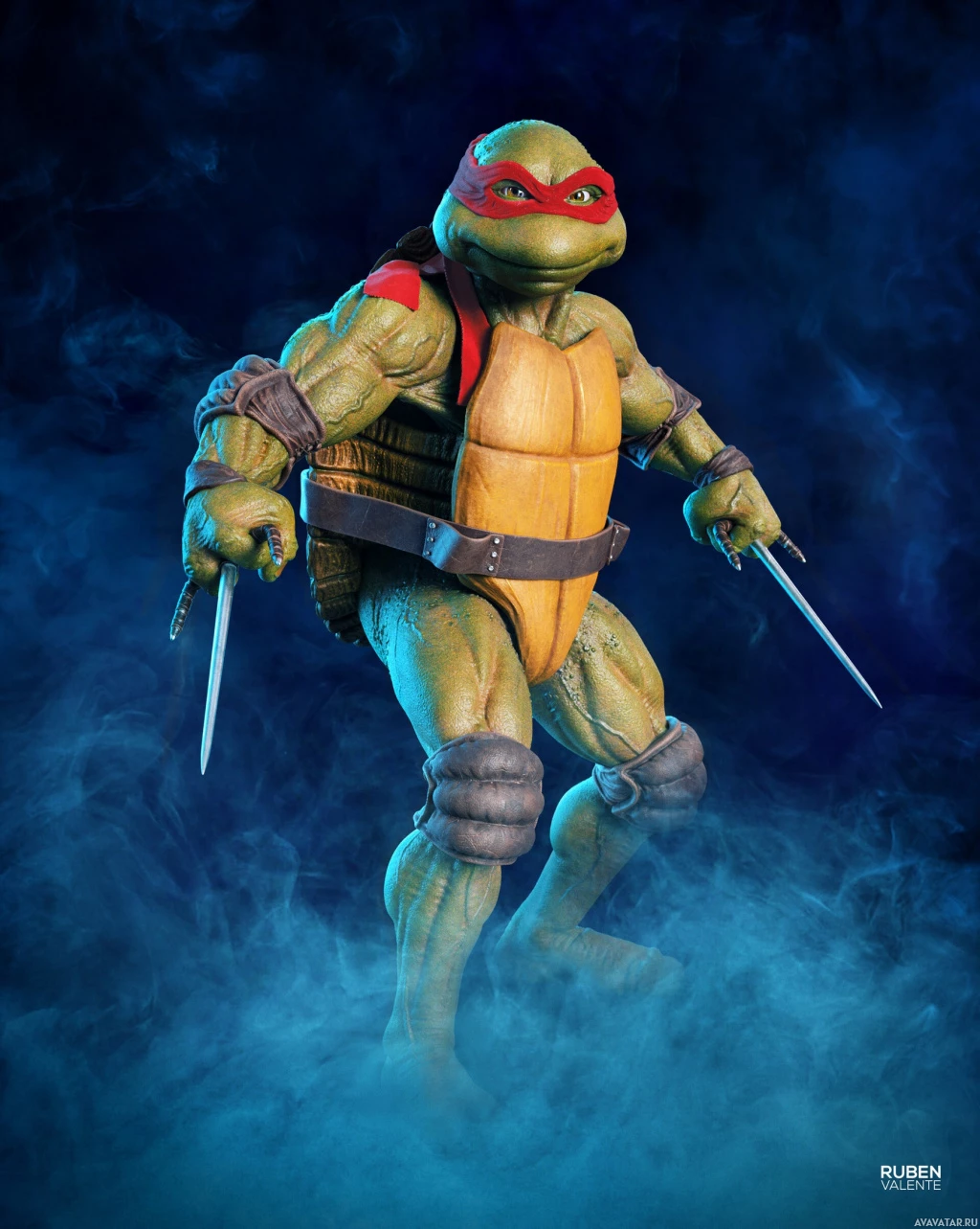 The image shows a figure of Raphael, one of the Teenage Mutant