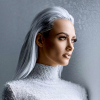 a high neckline, and there appears to be a contrasting color or material on the sides of her head. The background is minimalistic, featuring