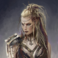 blonde hair. She has an elaborate headdress and is adorned with various necklaces and jewelry that suggest she might be of high status or from