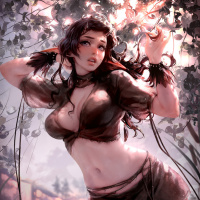 brown hair, pointed ears that are characteristic of fantasy elves, and is wearing a simple outfit that suggests she might be from a tribal or wilderness-oriented setting. The background includes lush greenery and a serene