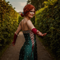 The image shows a person dressed in costume, presumably to portray the character of Triss Merigold from