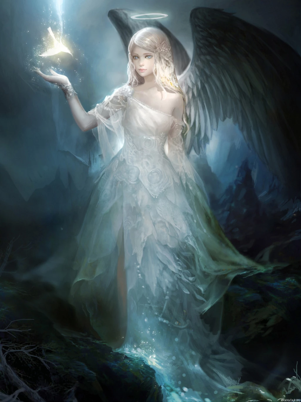 a fantasy setting and holds what seems to be a magical or divine object in their hand. They are surrounded by dark, moody scenery that contrasts with their ethereal appearance. The overall atmosphere of the image suggests a scene from a fantasy narrative or a concept piece for