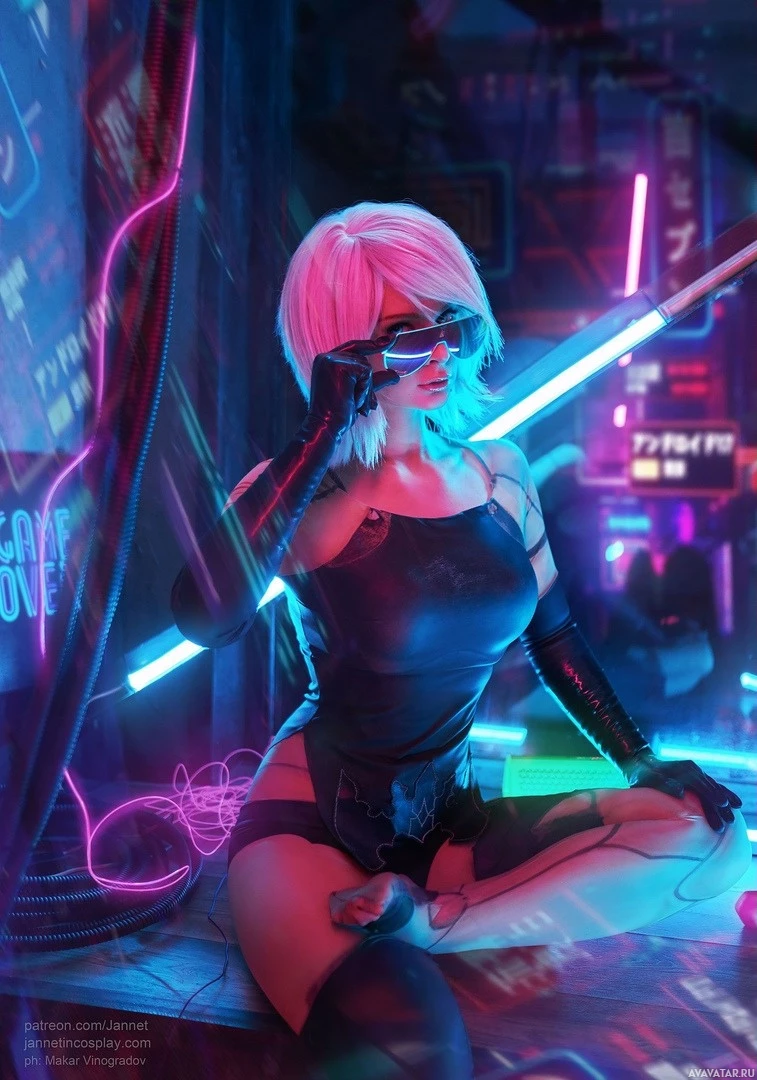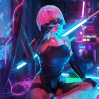 an urban setting with neon lights, signs, and digital displays, suggesting a futuristic or cyberpunk theme. The character appears to be in