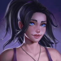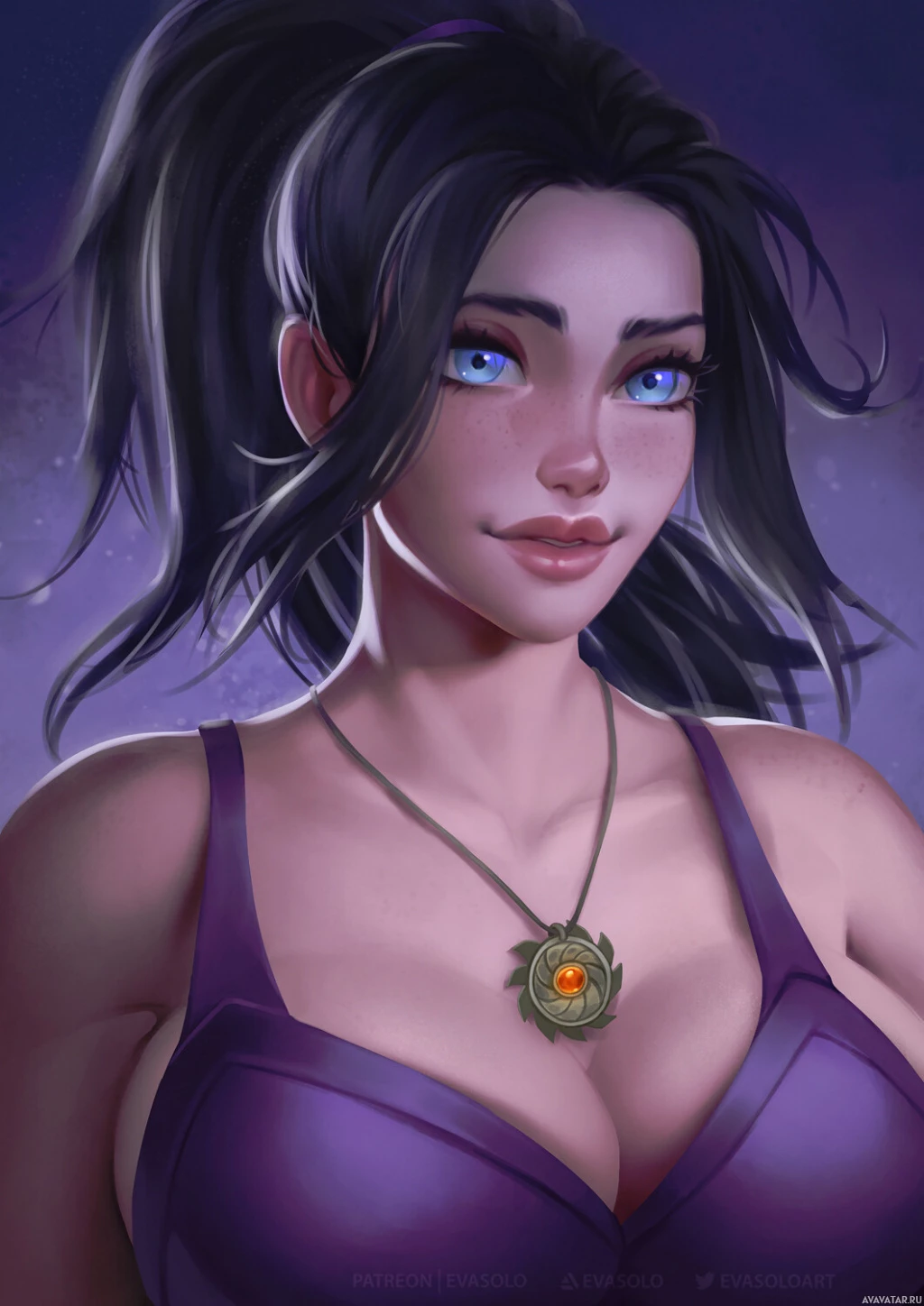 a purple outfit that looks like a sleeveless top or dress with a necklace around her neck. The style of the image suggests it could be from