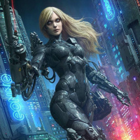 a female character with blonde hair, dressed in futuristic or cyberpunk-inspired attire. She appears to be wearing armor or a bodysuit with advanced technology elements, suggesting she is part of