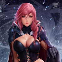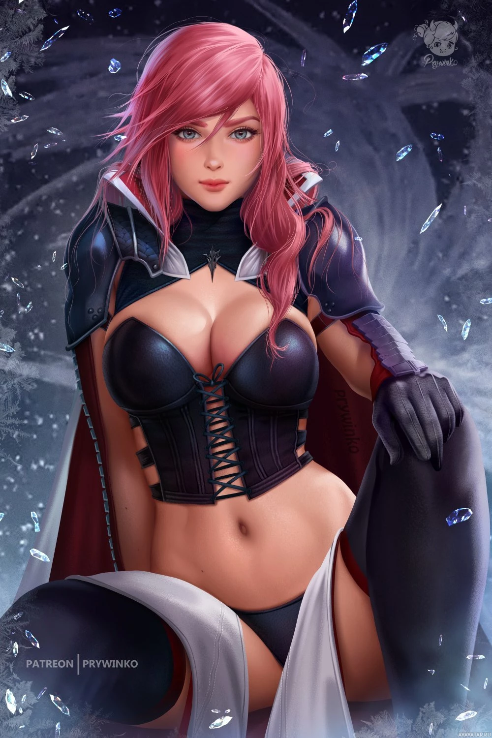 pink hair and is depicted in what appears to be fantasy-style armor with a dark and gothic design. She is wearing thigh-