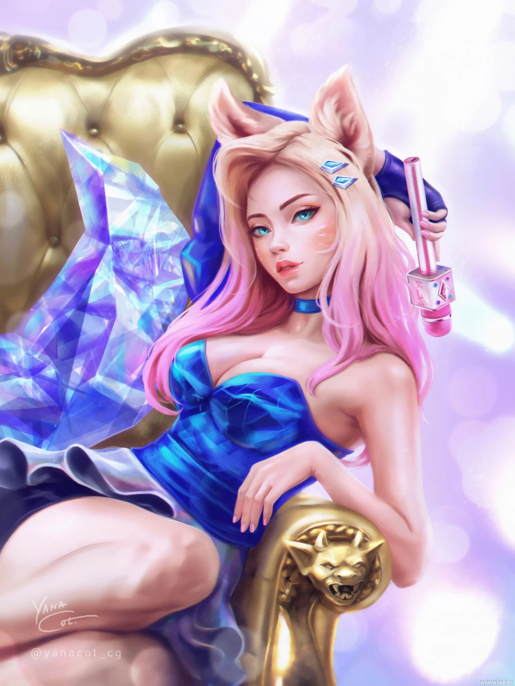 a blue dress and accessories that include what seems to be a microphone or a headset around her neck. The background is vibrant with