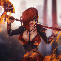 a chaotic scene with flames, suggesting that she might be involved in some sort of battle or conflict. The character's intense gaze and