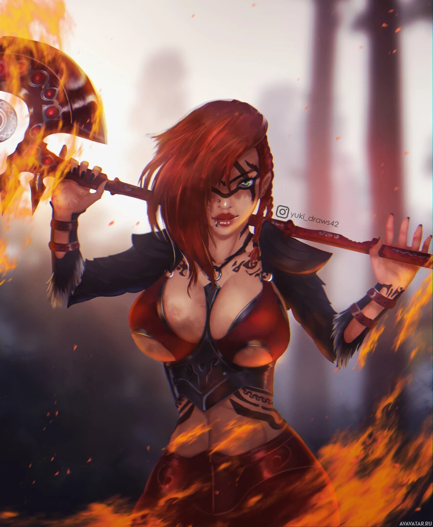 a red armor with black accents and is holding an axe in her hands. Behind her, there appears to be