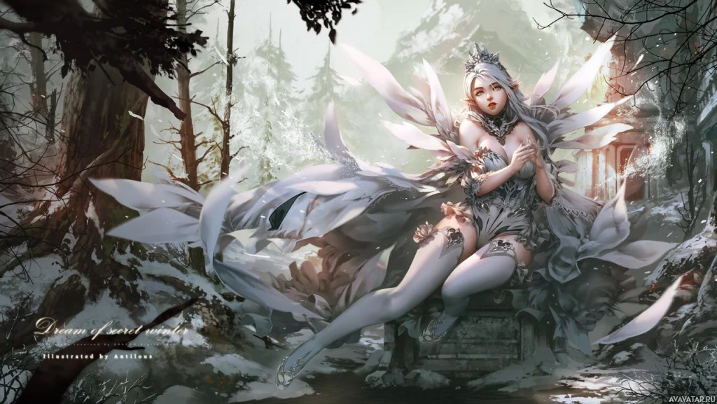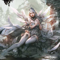 feathered wings, which suggests she may have avian or angelic characteristics. The artwork is highly detailed, conveying