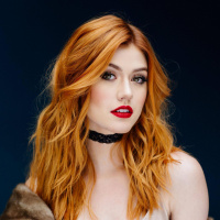 The picture shows a young woman with long red hair. She has an elegant style, wearing a sleeveless top and holding a fur stole. Her makeup is well-done with dark eyeshadow and bold red lipstick, giving her a striking appearance.