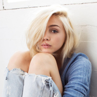 blonde hair and is wearing a blue jacket, denim pants, and no shoes. Her posture is relaxed, with her arms resting by her sides. The setting appears to be