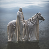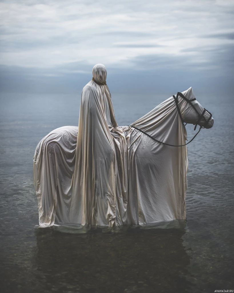 the back of a horse that is also covered with a sheet or material, giving it a ghostly appearance as well. They are both submerged in water up to their bodies. The background suggests