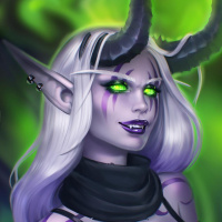 animated character with fantasy elements. The character has elongated ears and pointed ears, suggesting an elf-like appearance, and is adorned with green energy emanating from her eyes and horns on her head, which could indicate