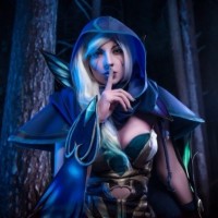 a fantasy setting. The cosplayer is standing in what appears to be a forest or woodland background, which complements the character's theme.
