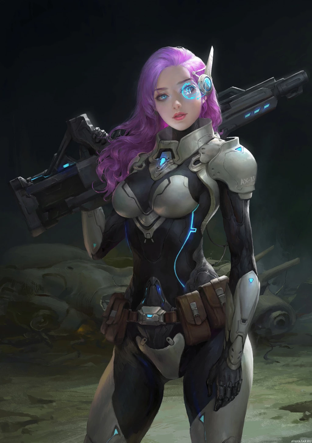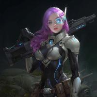 a science fiction setting, as suggested by the presence of what looks like cybernetic or robotic parts in her design. The character is also holding a weapon, which contributes to the science fiction theme.