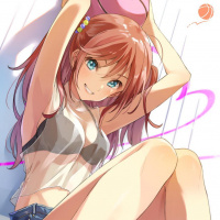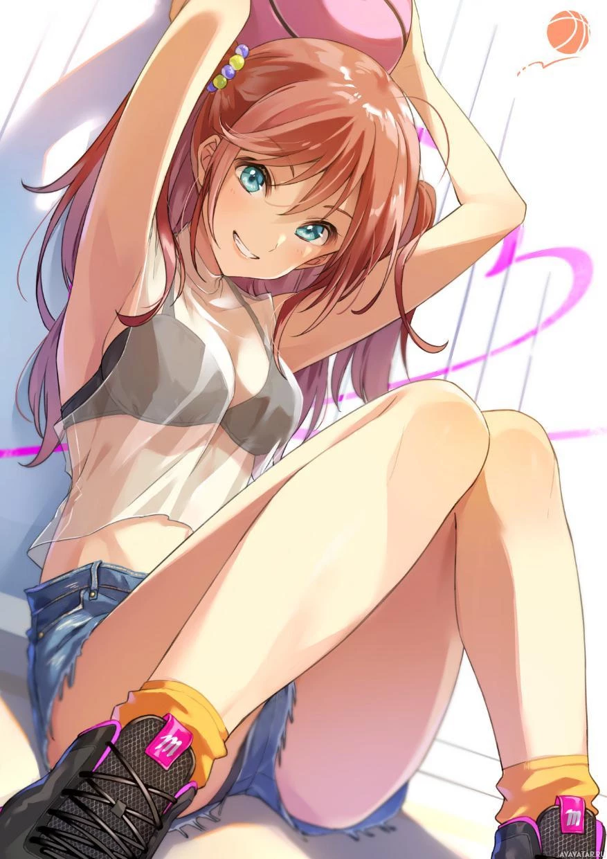 The image shows an illustration of a red-haired girl who appears to be from an anime. She is sitting with her legs crossed and is wearing shorts and sneakers. She has