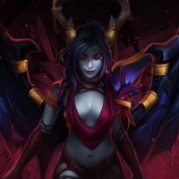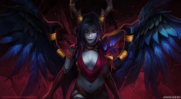 a menacing expression, holding what appears to be an object that could be a weapon or artifact associated with her character in the game. The background is dark and moody, fitting the fantasy theme commonly associated with Dota 2.
