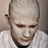 an interesting contrast between the smooth skin that is still visible on the neck and hands and the rough texture covering the rest of the face and upper chest. It's an artistic representation, likely intended to evoke