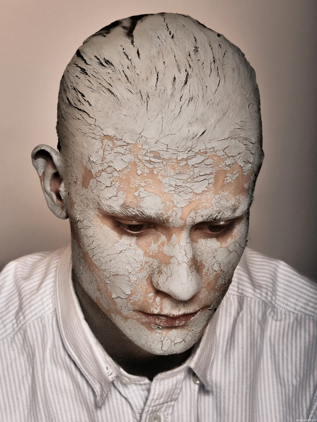 The image shows a person whose face and upper body are covered with some kind of